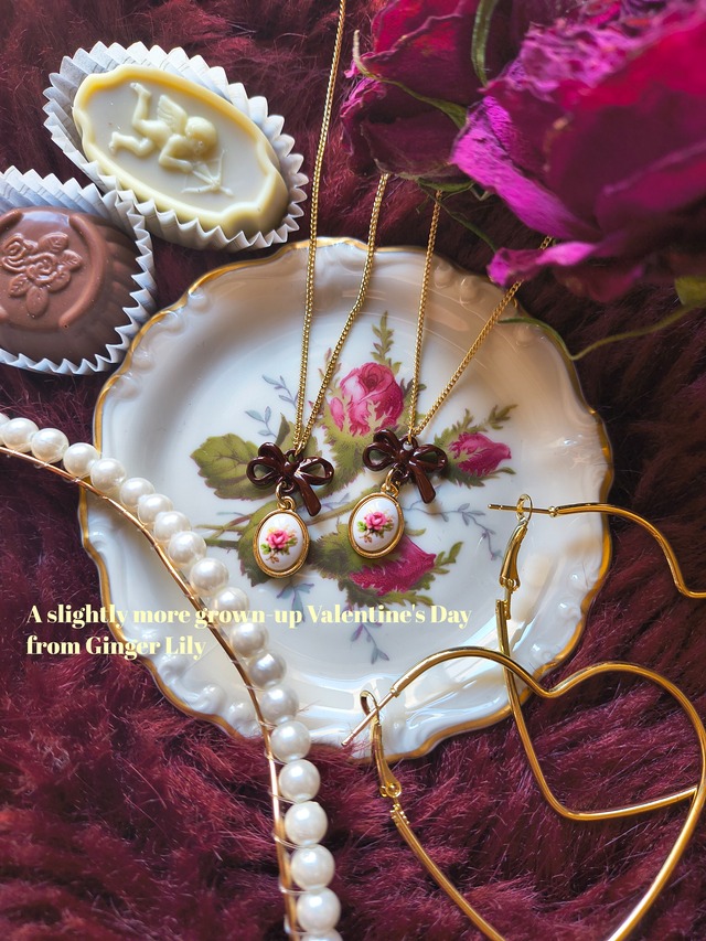 海外から仕入れた数量限定のパーツを使用した アンティーク感のあるデザインのネックレス。 ワインレッドのリボンパーツと合わせ 可愛さの中に大人な落ち着いた印象に。 シックでガーリーなコーデにはもちろん、 カジュアルコーデや普段使いにも 着用していただけます。 2月限定のラッピングで とっても可愛くお届けいたします。 皆さまにロマンティックなバレンタインが 訪れることを願って…♡ 【size】 長さ:40cm ※長さ調整はできないタイプです。